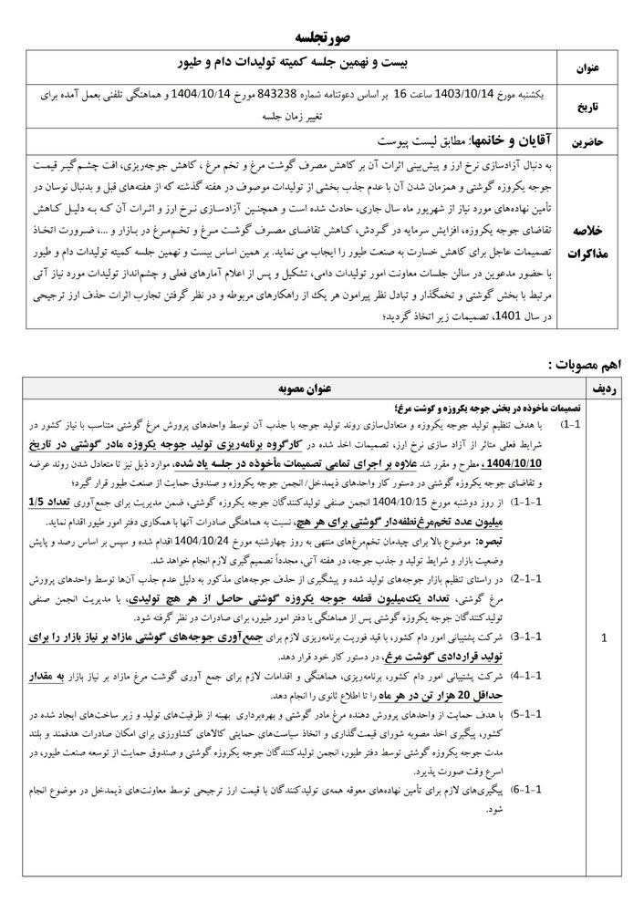 بر اساس این سند رسمی، جلسه مذکور با توجه به نوسانات شدید بازار نهادهها، کاهش مصرف گوشت مرغ و تخممرغ، افت قیمت جوجه یکروزه گوشتی و افزایش هزینههای تولید برگزار شده و مسئولان وزارت جهاد کشاورزی به این جمعبندی رسیدهاند که ادامه وضعیت موجود میتواند به زیان جدی صنعت طیور منجر شود.