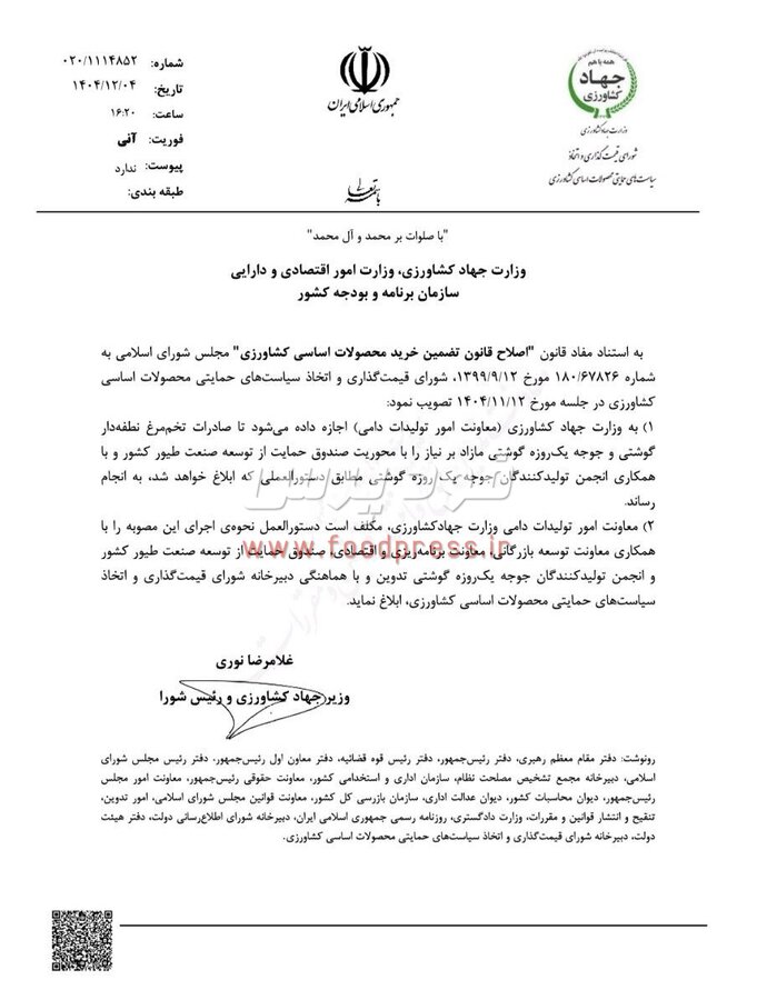 شورای شورای قیمت گذاری و اتخاذ سیاست های حمایتی محصولات کشاورزی مجوز صادرات تخم مرغ نطفه دار گوشتی و جوجه یک روزه گوشتی مازاد بر نیاز را تصویب کرد.